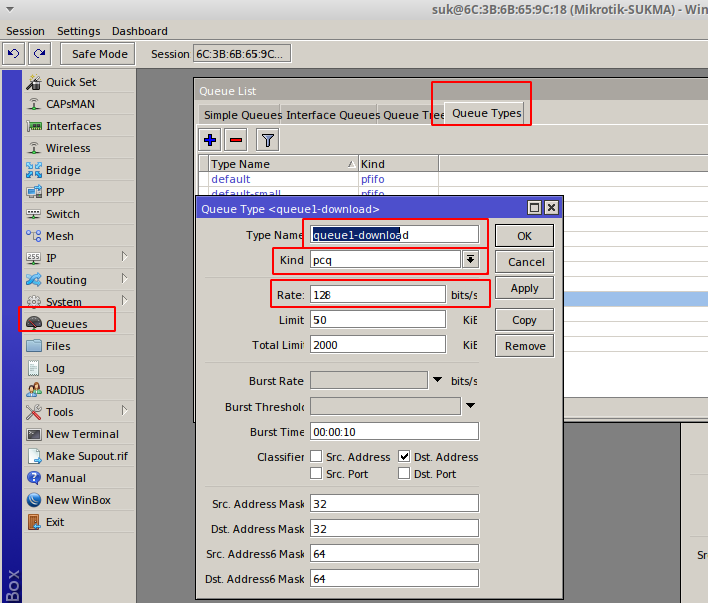 5. Pindah ke tab menu Advanced,kemudian ubah Queue type dengan yang telah dibuat tadi,yaitu Upload dan Download.